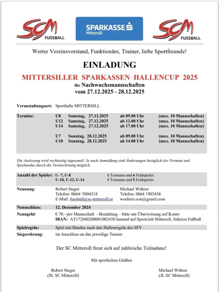 Der SC Mittersill lädt auch heuer wieder zum Mittersiller Sparkassen Hallencup für Nachwuchsmannschaften ein. Am 27. und 28. Dezember 2025 treten Teams von U7 bis U14 in der Sporthalle Mittersill gegeneinander an.