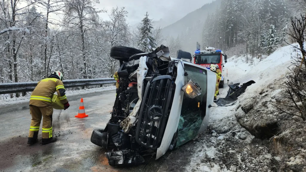 Gemeinsam mit der Feuerwehr Saalfelden konnte der umgestürzte Lieferwagen mithilfe eines schweren Rüstfahrzeuges wieder aufgestellt werden. Die Feuerwehr Lofer sicherte die Unfallstelle ab, band auslaufende Betriebsmittel, stellte den Brandschutz sicher und unterstützte sowohl die Feuerwehr Saalfelden als auch das Abschleppunternehmen bei den weiteren Maßnahmen.