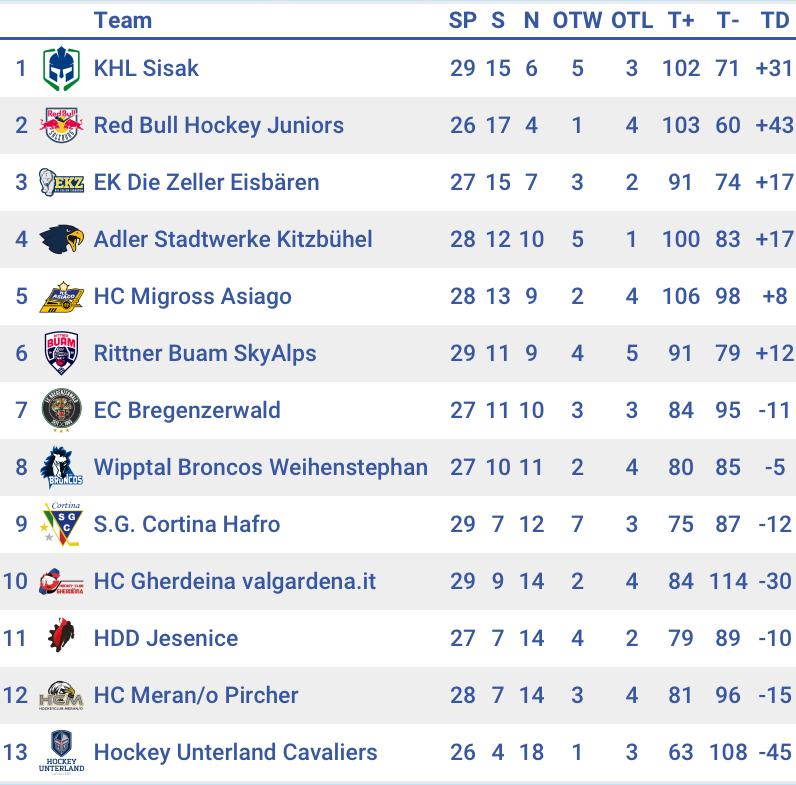 Am Dienstag endete das Kalenderjahr in der Alps Hockey League mit einem Erfolgslauf der Gastgeber: Alle sechs Heimteams konnten ihre Partien für sich entscheiden. Tabellenführer KHL Sisak verteidigte souverän die Spitzenposition, während sich die zweitplatzierten Red Bull Hockey Juniors nach ihrer Spielpause mit einem Kantersieg zurückmeldeten. Zell am See und Kitzbühel setzten sich jeweils „nach Überstunden“ durch, Asiago feierte den dritten Sieg in Folge und kletterte damit auf Rang fünf. Zudem hielt Bregenzerwald Anschluss an die Masterround-Plätze.
