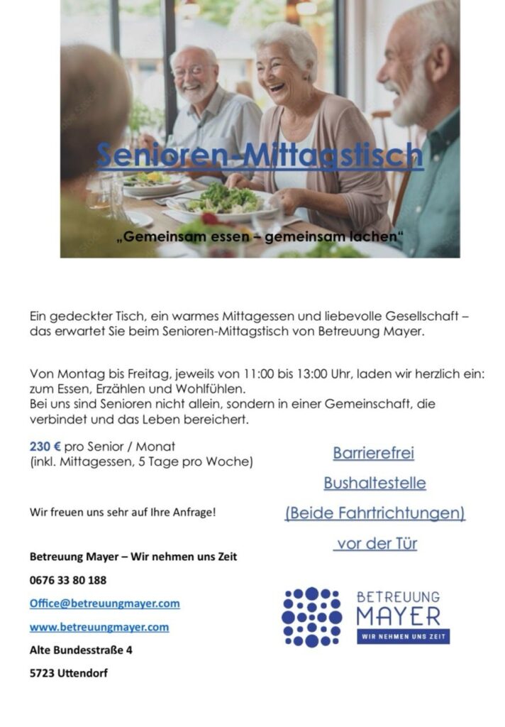 Der Beitrag soll einen Überblick über bestehende Unterstützungs- und Gemeinschaftsangebote in der Region geben. Das Essen zum Mittagstisch wird täglich frisch von einem Uttendorfer Traditionsgasthaus zubereitet und startet am 02.02.2026!