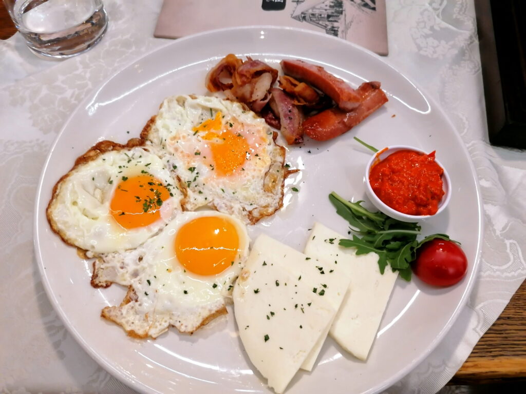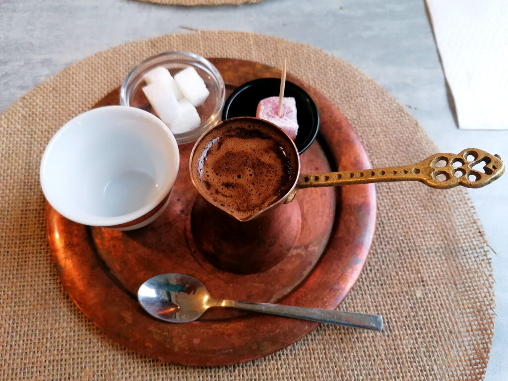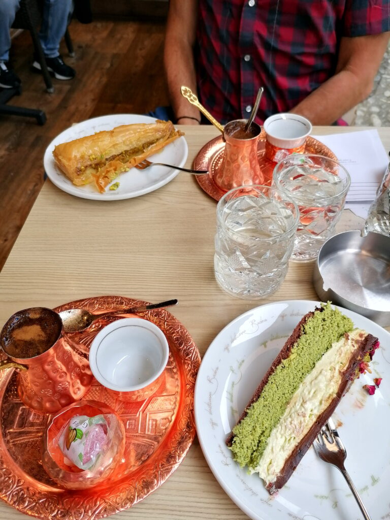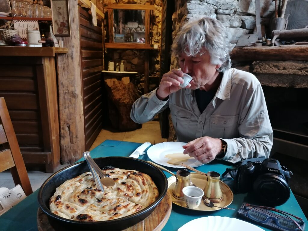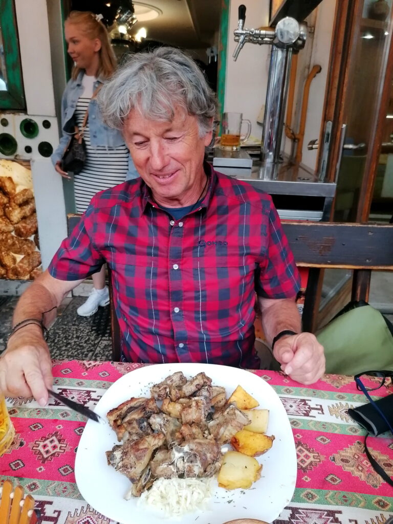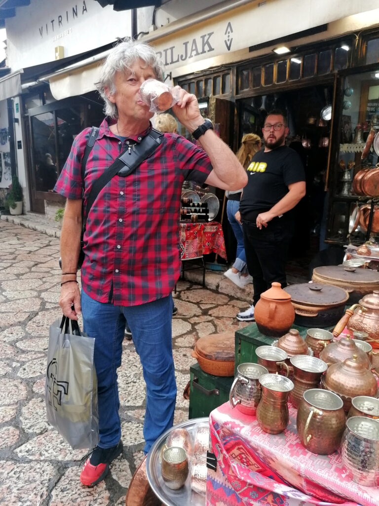 Zuerst gab es eine bosnische Vorspeisenplatte mit Schinken und Käse, dazu Salat und ein hervorragendes Gulasch. Dazu probierten wir einen kräftigen, gehaltvollen bosnischen Rotwein – sehr empfehlenswert! Den Abschluss bildete wie immer der klassische bosnische Kaffee, stilgerecht in der Kupferkanne serviert.