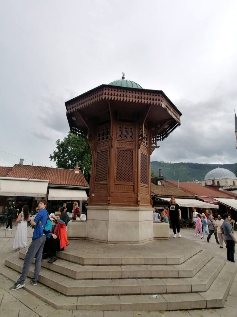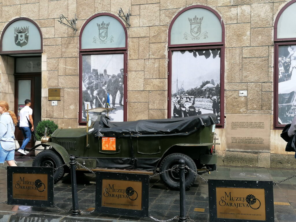 Vom Zentrum aus landen wir direkt in der Altstadt am Museum zum Attentat auf Erzherzog Franz Ferdinand und seine Frau Sophie, auf der gegenüberliegenden Seite der Brücke über die Miljacka. Hier wurde Franz Ferdinand von Gavrilo Princip ermordet, was den Ausbruch des Ersten Weltkriegs auslöste. Im Museum sind die Waffe und die Uniform des Täters ausgestellt; vor dem Gebäude steht das offene Wagenmodell, in dem die Opfer saßen.