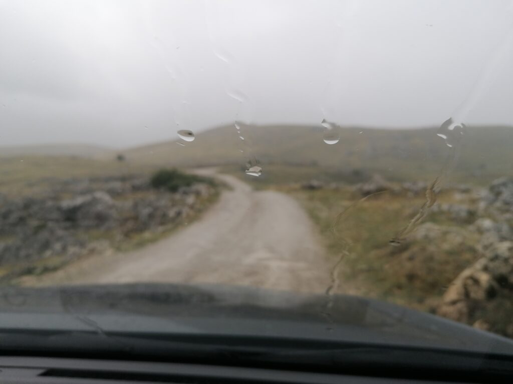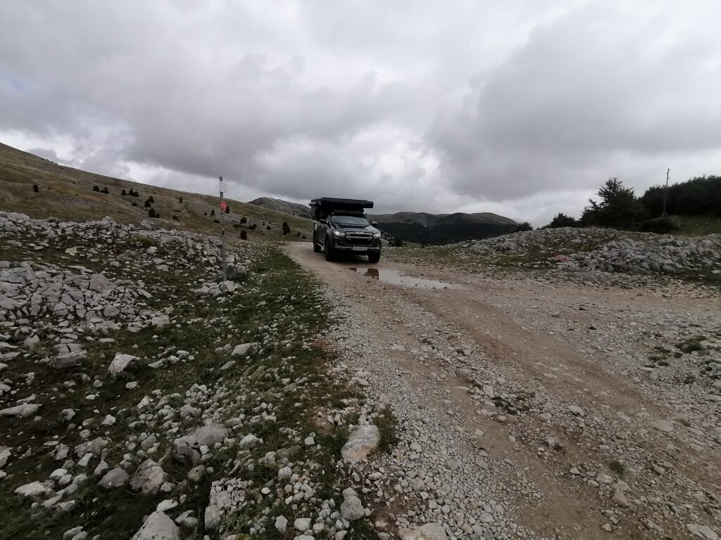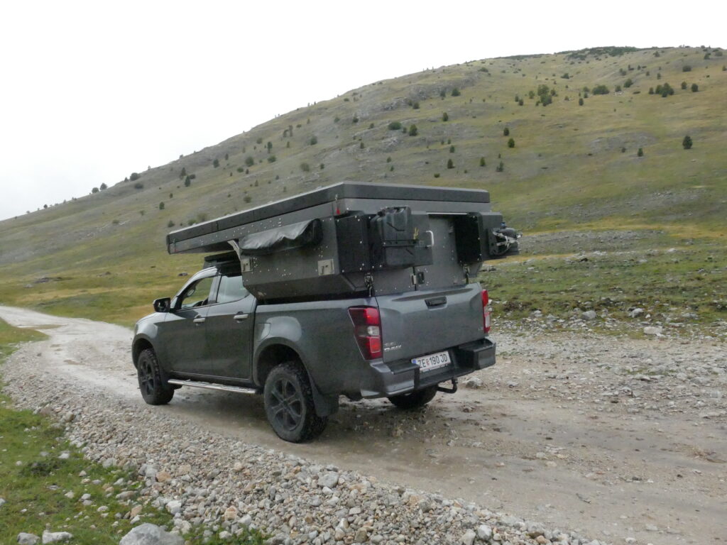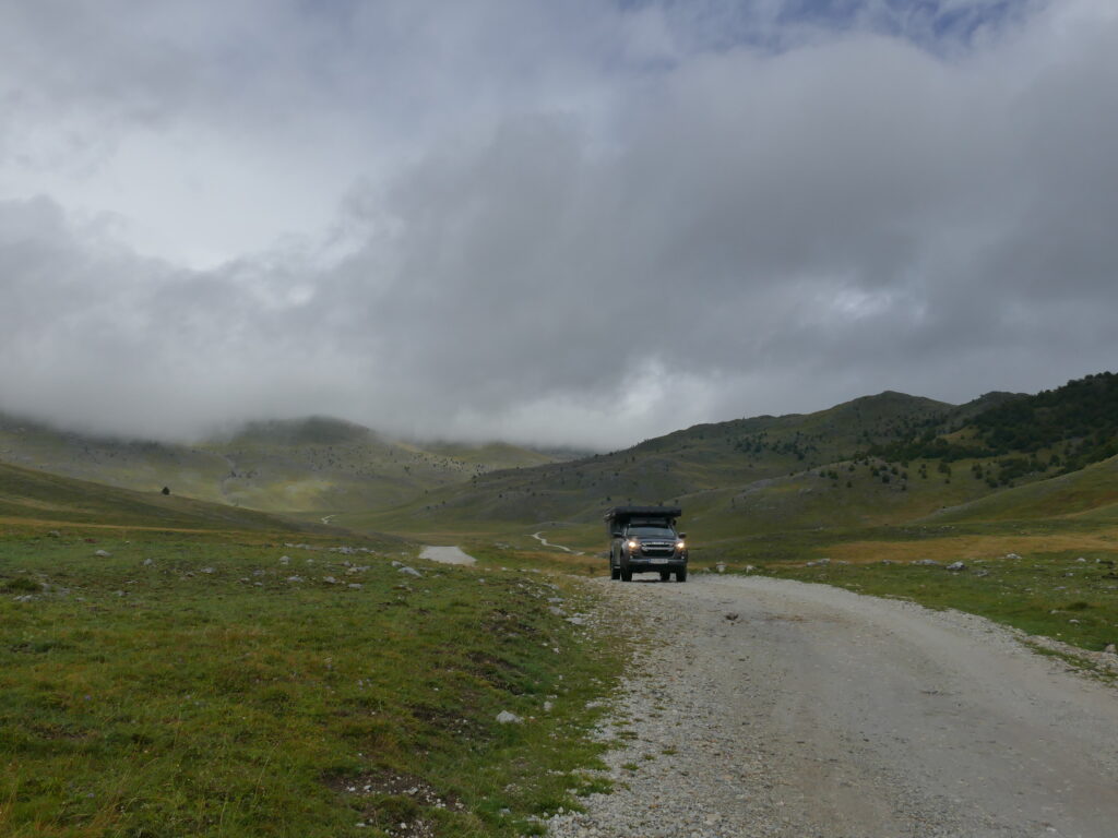 Auf einem Hochplateau mit steileren Aufschwüngen, gab es Immer wieder neue Perspektiven und Ausblicke auf Dolinen und Bergkuppen. Tiefe Spurrillen und Wasserlöcher erforderten konzentriertes Fahren auf dieser einspurigen Schotterpiste, besonders auch bei entgegenkommenden, alten Lastwagen.